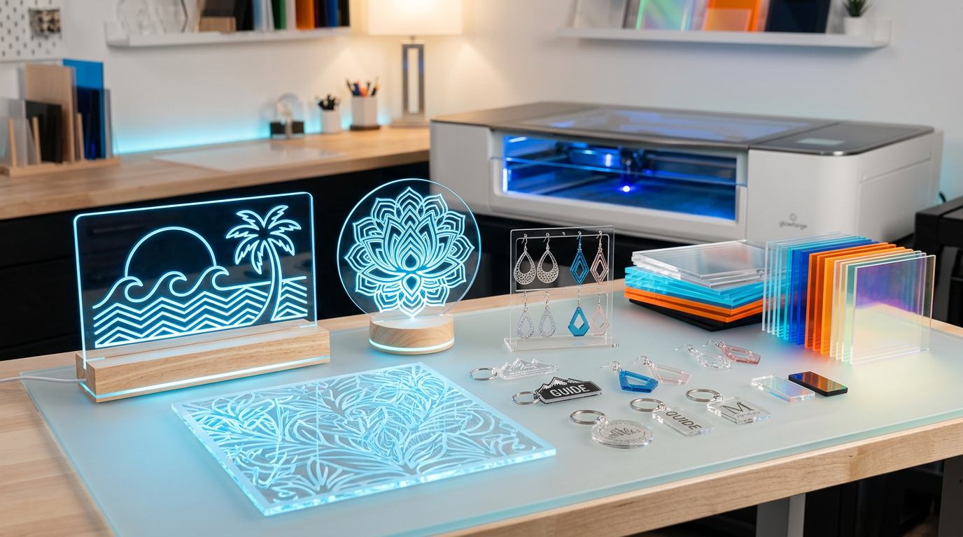 Learn to laser cut and engrave acrylic. Covers cast vs. extruded acrylic, settings, safety, and beginner project ideas like keychains and LED signs.