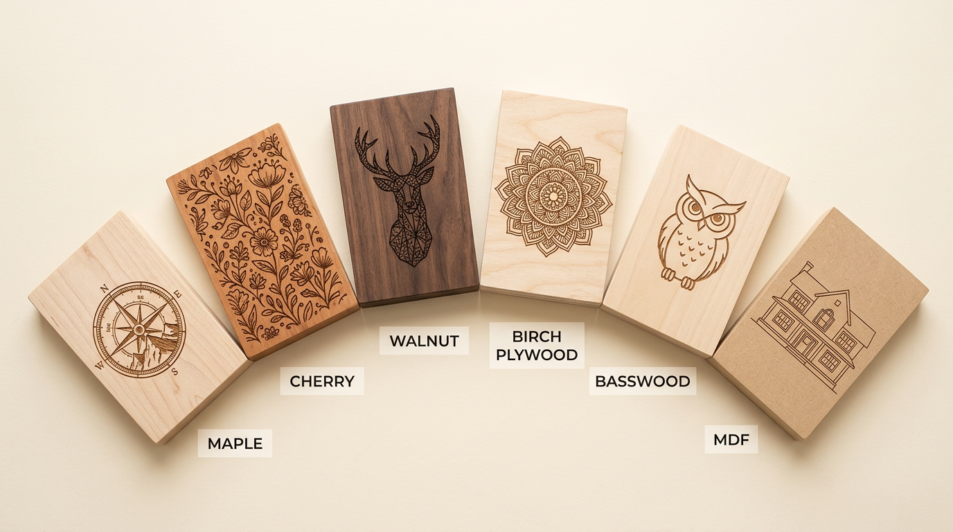 Find the best wood for your laser engraving and cutting projects. Compares basswood, birch plywood, maple, walnut, cherry, and more with pros and cons.