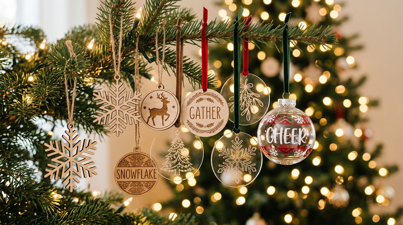 Make beautiful Christmas ornaments with SVG files. Projects for laser cutters, Cricut, and Silhouette machines using wood, acrylic, vinyl, and cardstock.