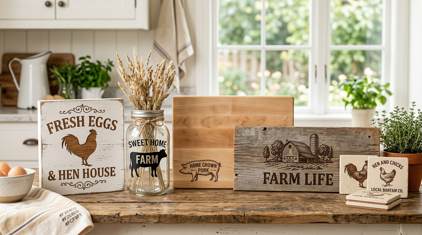 Create charming farmhouse decor with farm animal SVG designs. Project ideas for roosters, cows, horses, and country life themes on wood and more.