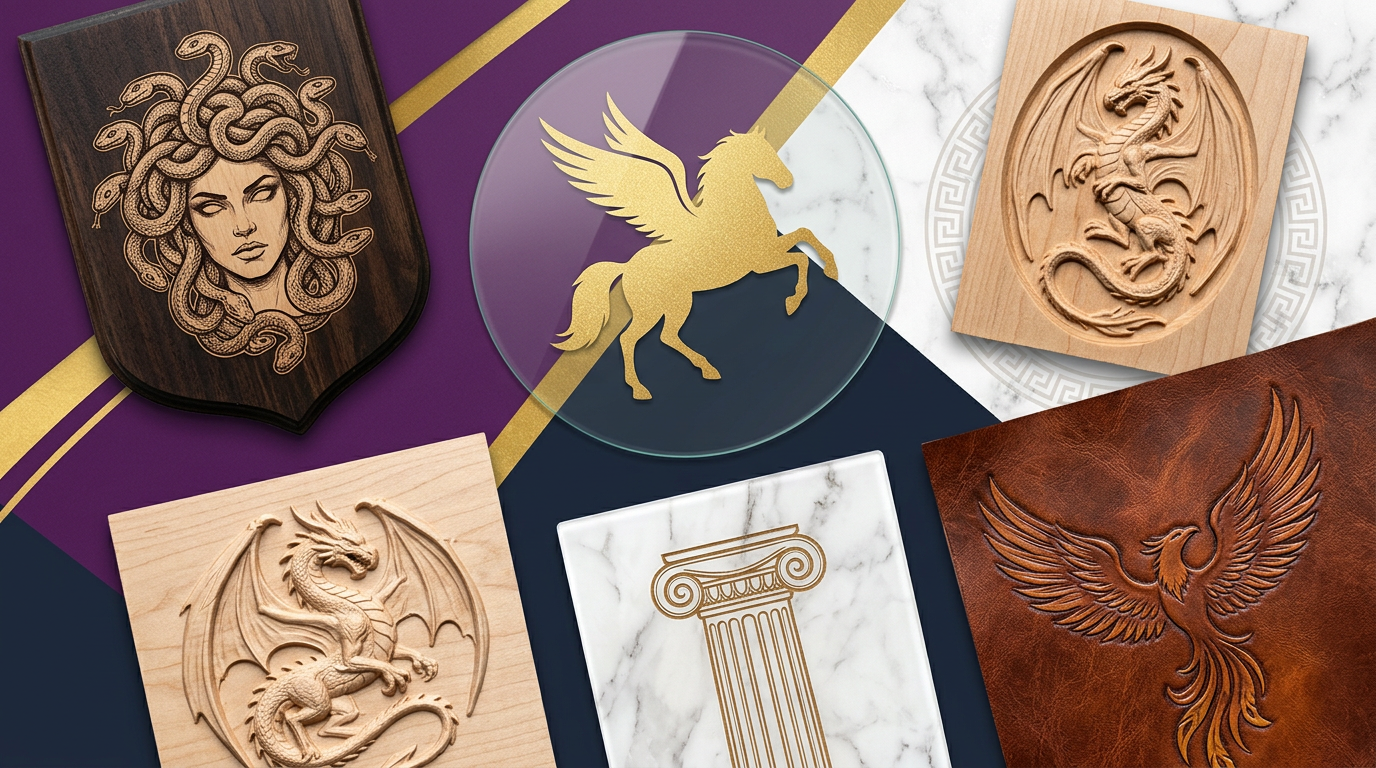 Create unique crafts with mythology and fantasy SVG designs. Project ideas for dragons, Greek gods, mythical creatures, and fantasy-themed laser and vinyl projects.