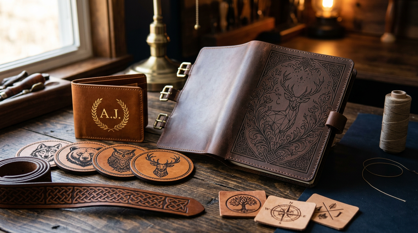 Master laser engraving on leather. Covers leather types, settings, safety, and project ideas for journals, wallets, belts, and patches.