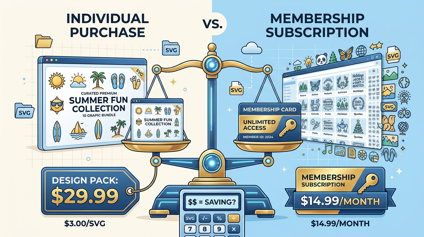Compare SVG subscriptions vs. buying individual design packs. Learn which option is more cost-effective for your crafting needs and business goals.