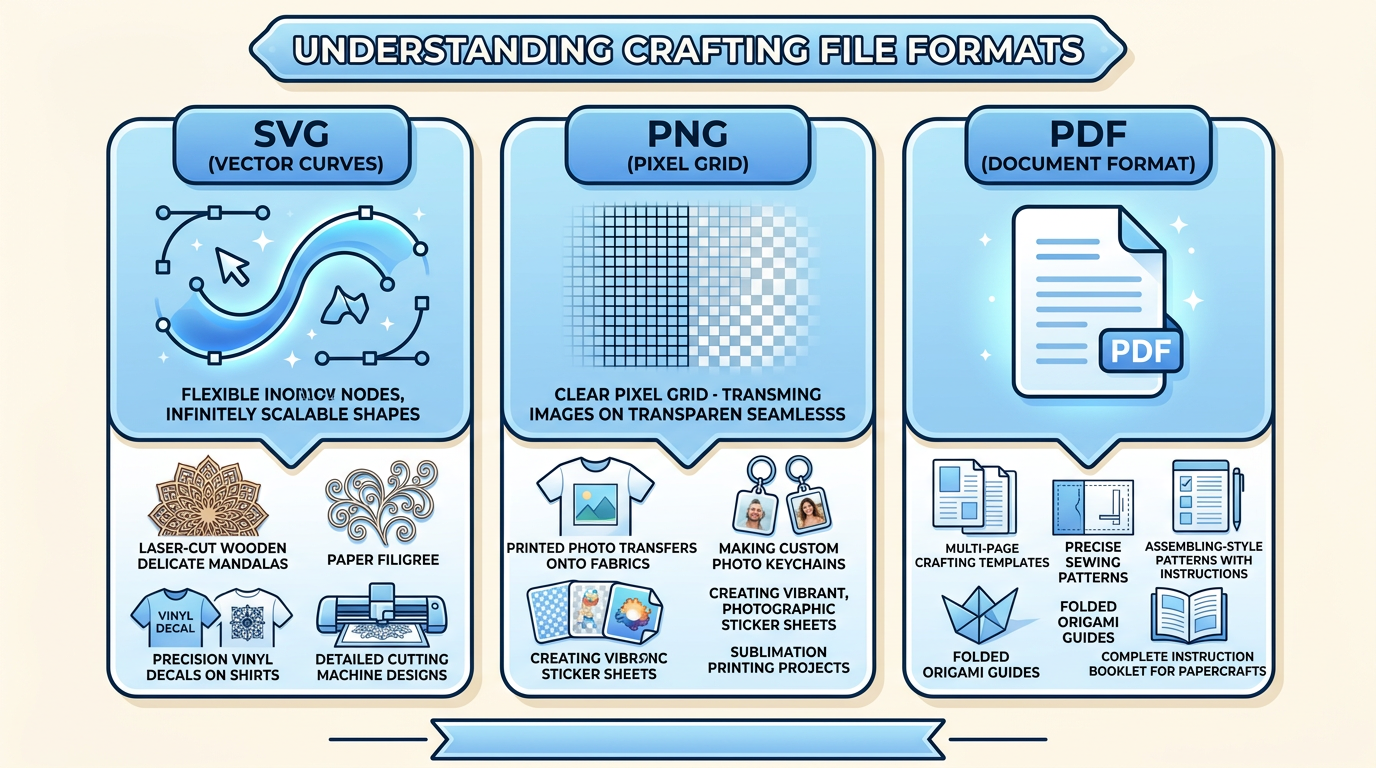 Compare SVG, PNG, and PDF file formats for crafting projects. Learn which format works best for cutting, engraving, sublimation, and printing.