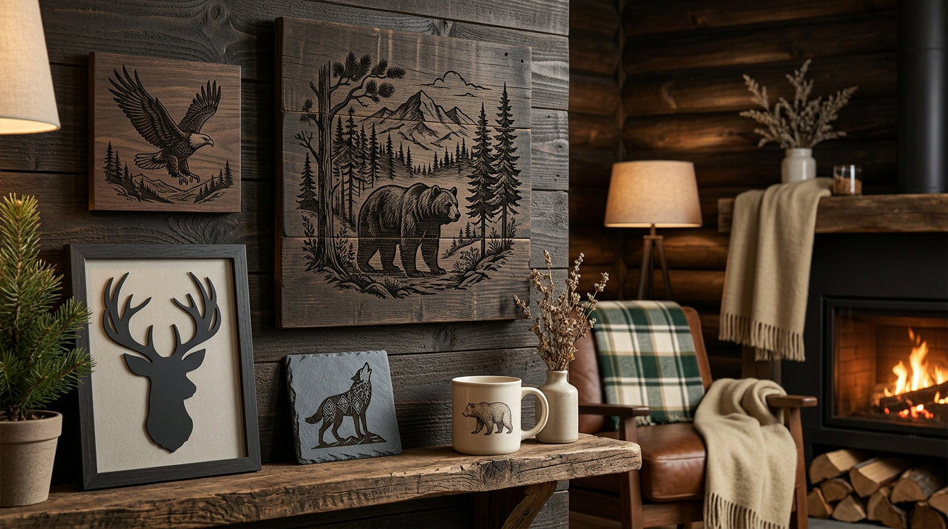 Create stunning rustic home decor with wildlife SVG designs. Project ideas for deer, bears, eagles, and forest scenes on wood, slate, and metal.