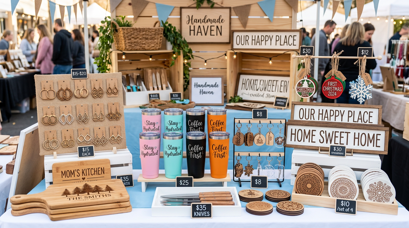 Discover the most profitable craft fair items to make with a laser cutter or Cricut. Proven sellers with tips on production, pricing, and display.