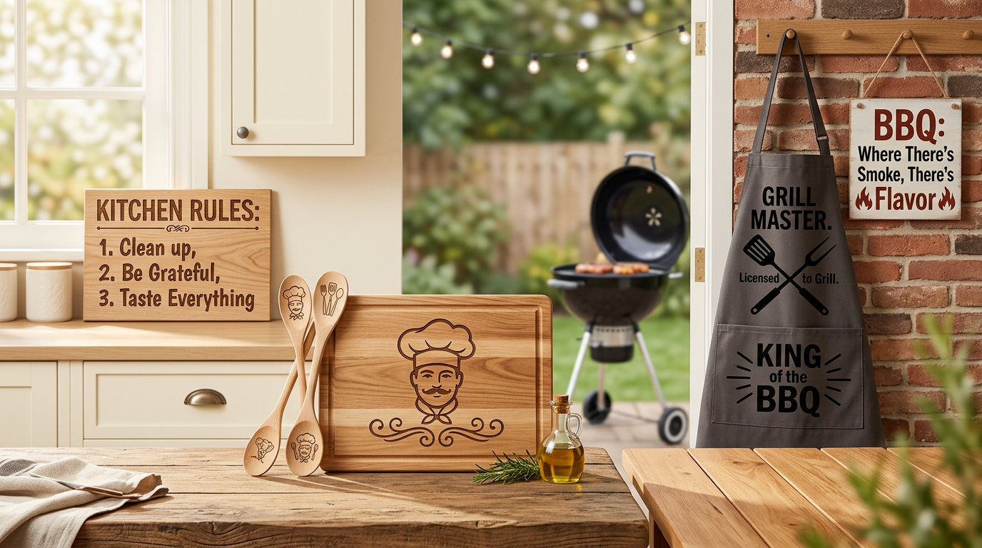 Create personalized kitchen and BBQ crafts with SVG designs. Project ideas for cutting boards, signs, aprons, grilling accessories, and gifts for cooks.