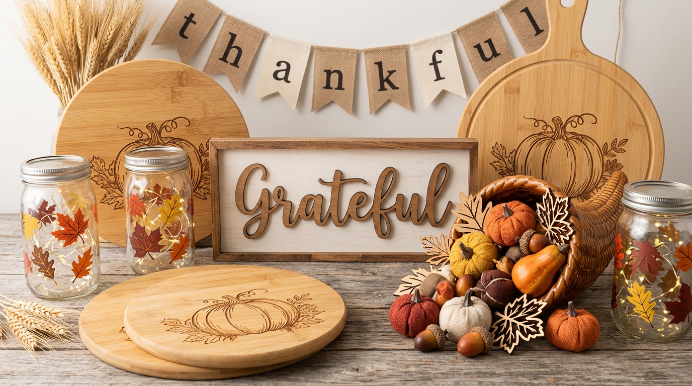Create beautiful fall and Thanksgiving decor with SVG design files. Project ideas for laser engravers, Cricut, and Silhouette machines.